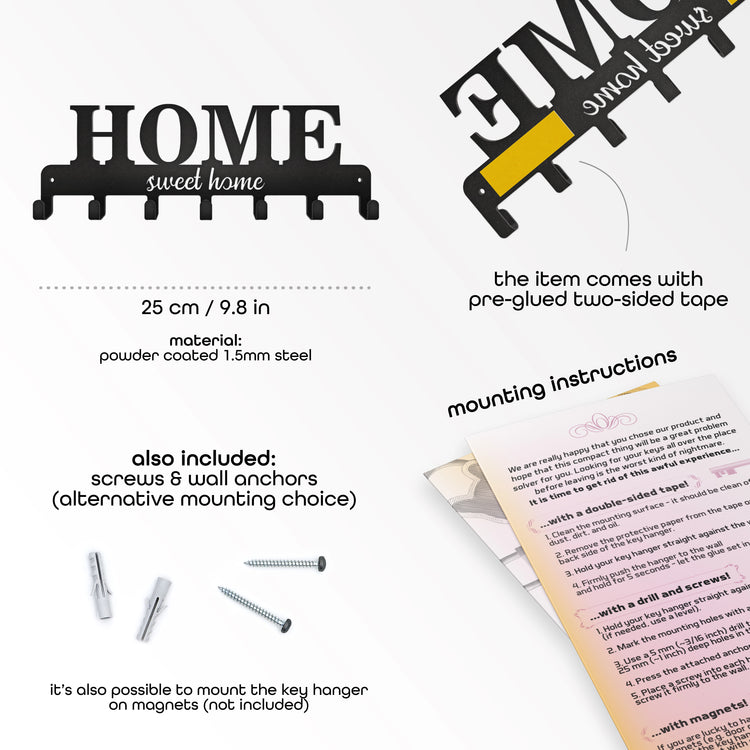 In the box of your order we include pre-glued adhesive tape on the item for the easiest fastest mountig option, screws and wall anchors if you need a sturdier mount, and detailed instructions to make the process as simple as possible.