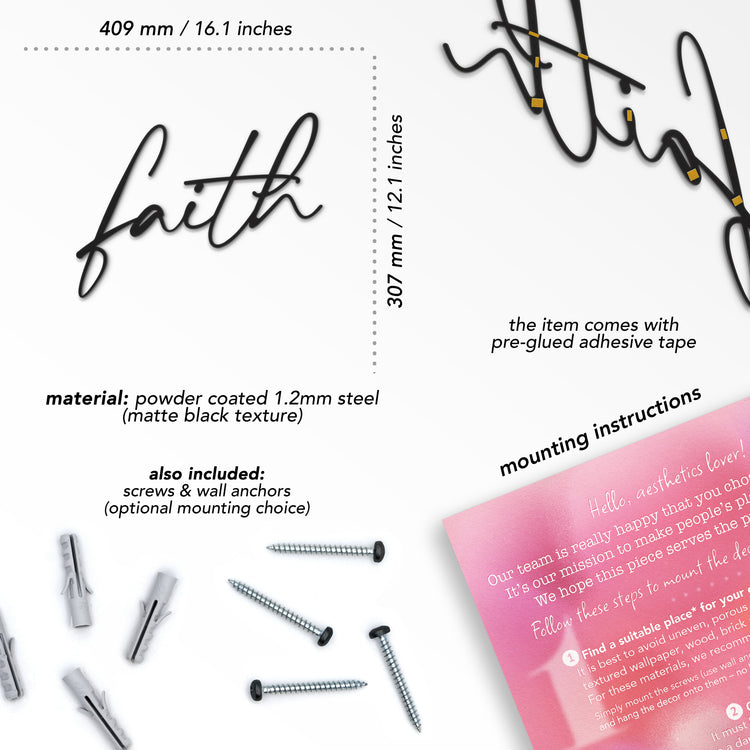 In the box of your order we include pre-glued adhesive tape on the item for the easiest fastest mountig option, screws and wall anchors if you need a sturdier mount, and detailed instructions to make the process as simple as possible.