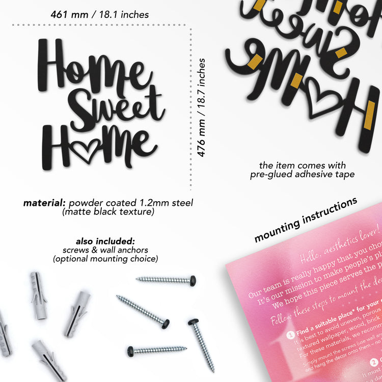 In the box of your order we include pre-glued adhesive tape on the item for the easiest fastest mountig option, screws and wall anchors if you need a sturdier mount, and detailed instructions to make the process as simple as possible.