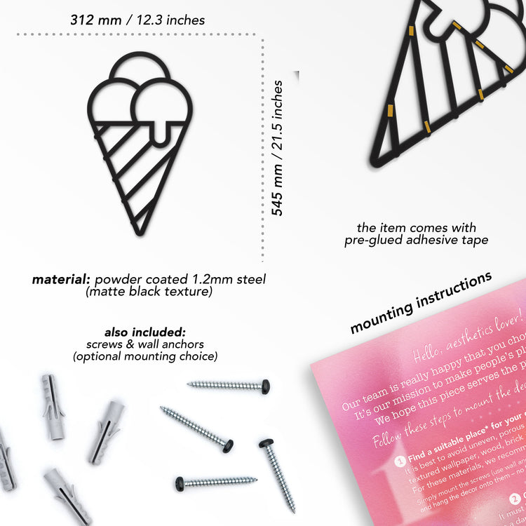 In the box of your order we include pre-glued adhesive tape on the item for the easiest fastest mountig option, screws and wall anchors if you need a sturdier mount, and detailed instructions to make the process as simple as possible.