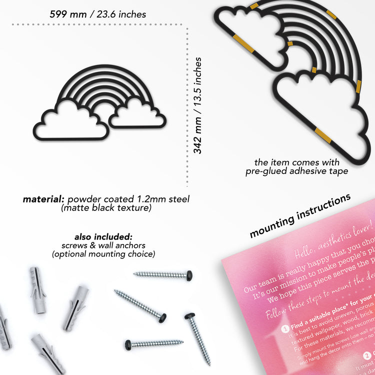 In the box of your order we include pre-glued adhesive tape on the item for the easiest fastest mountig option, screws and wall anchors if you need a sturdier mount, and detailed instructions to make the process as simple as possible.