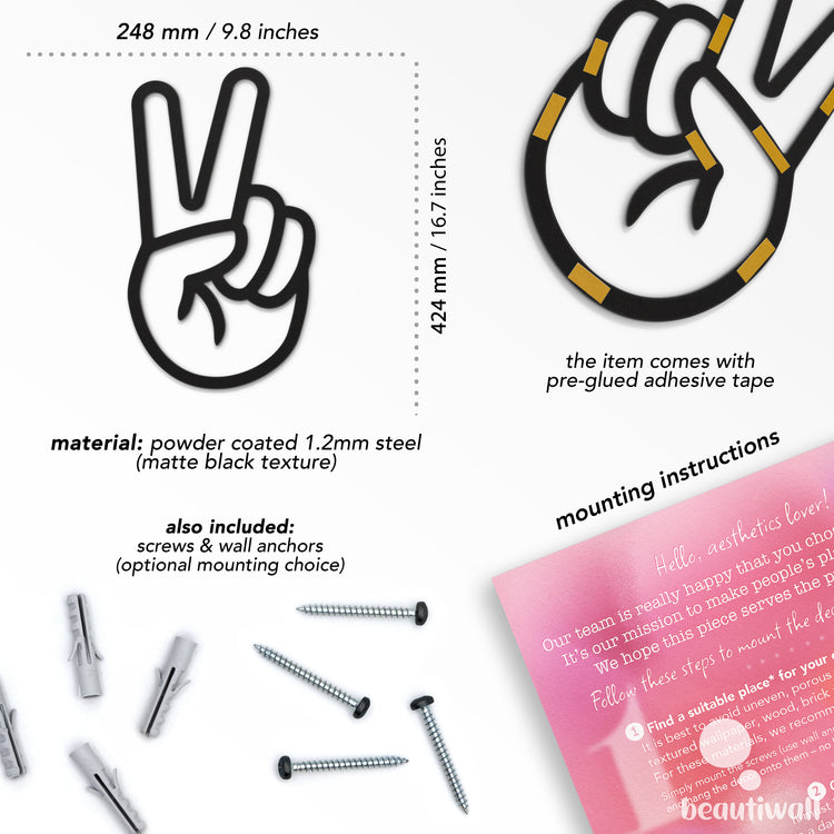 In the box of your order we include pre-glued adhesive tape on the item for the easiest fastest mountig option, screws and wall anchors if you need a sturdier mount, and detailed instructions to make the process as simple as possible.
