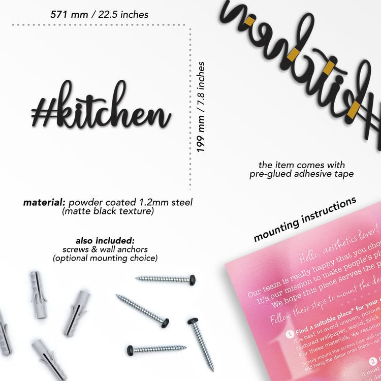 In the box of your order we include pre-glued adhesive tape on the item for the easiest fastest mountig option, screws and wall anchors if you need a sturdier mount, and detailed instructions to make the process as simple as possible.
